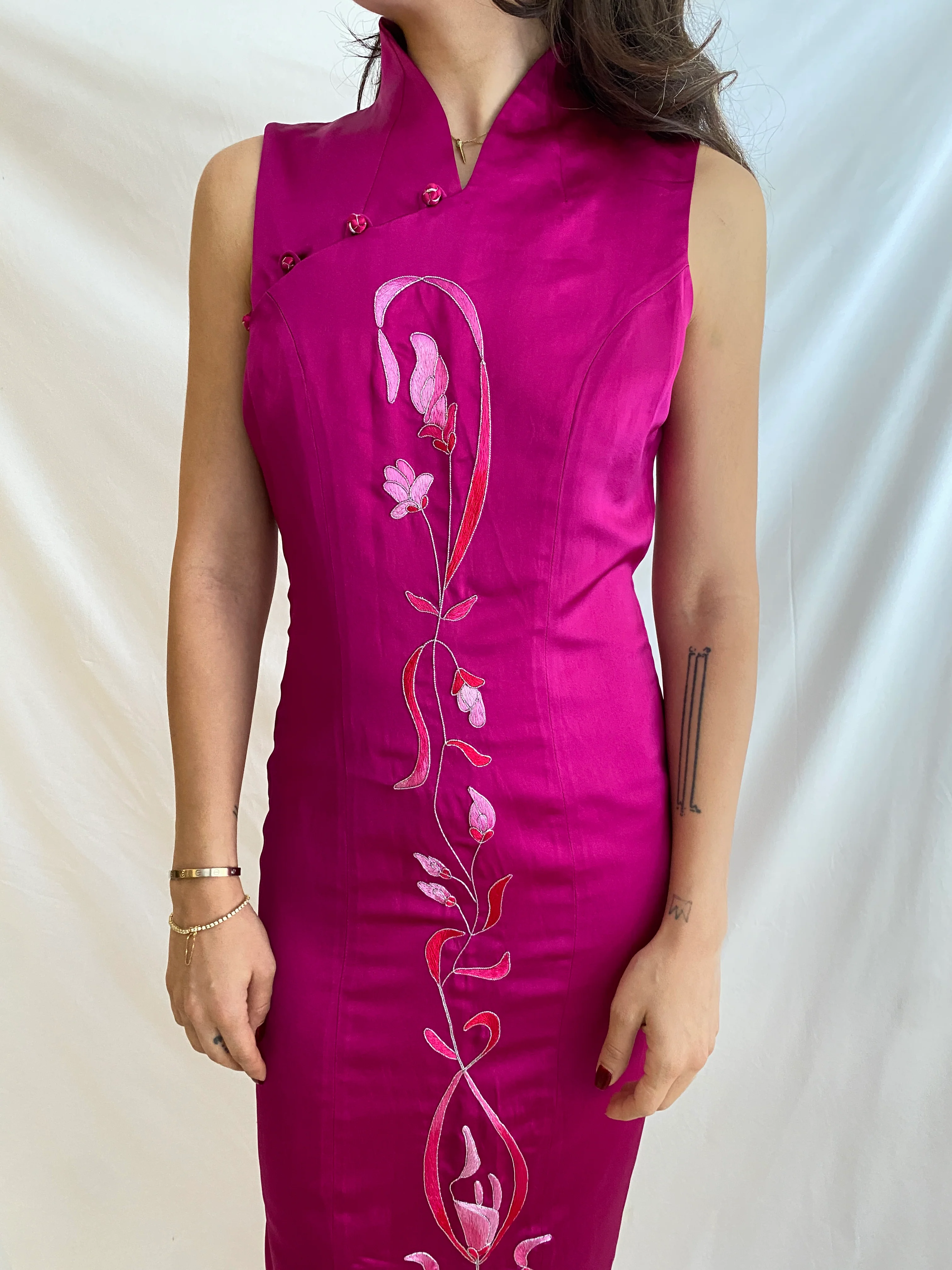 Hand-selected vintage cheongsam dress in fuchsia silk and floral embroideries.