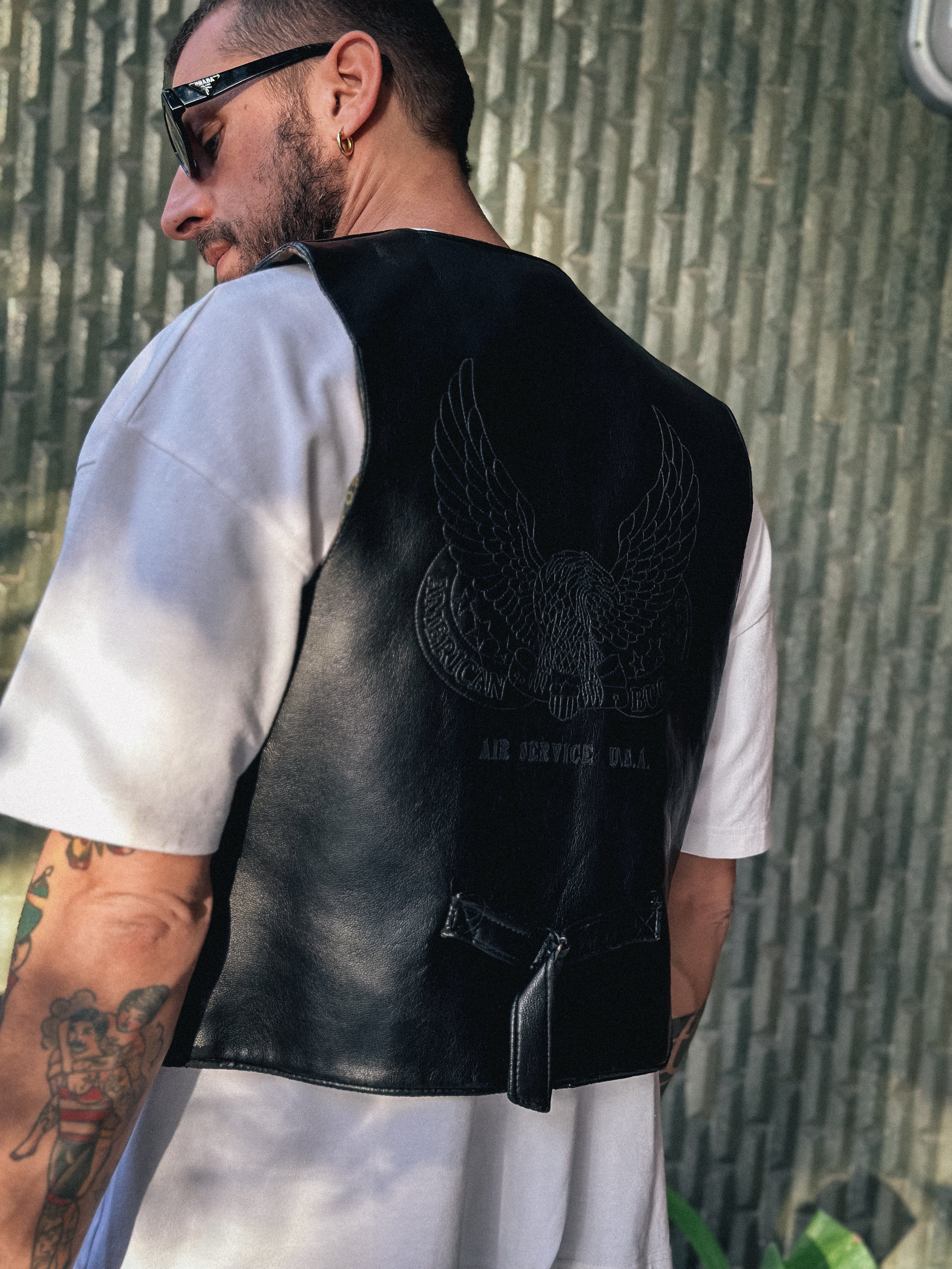 Hand-selected vintage leather vest made in Italy with bronze buttons and eagle stamp on the right chest and at the back.