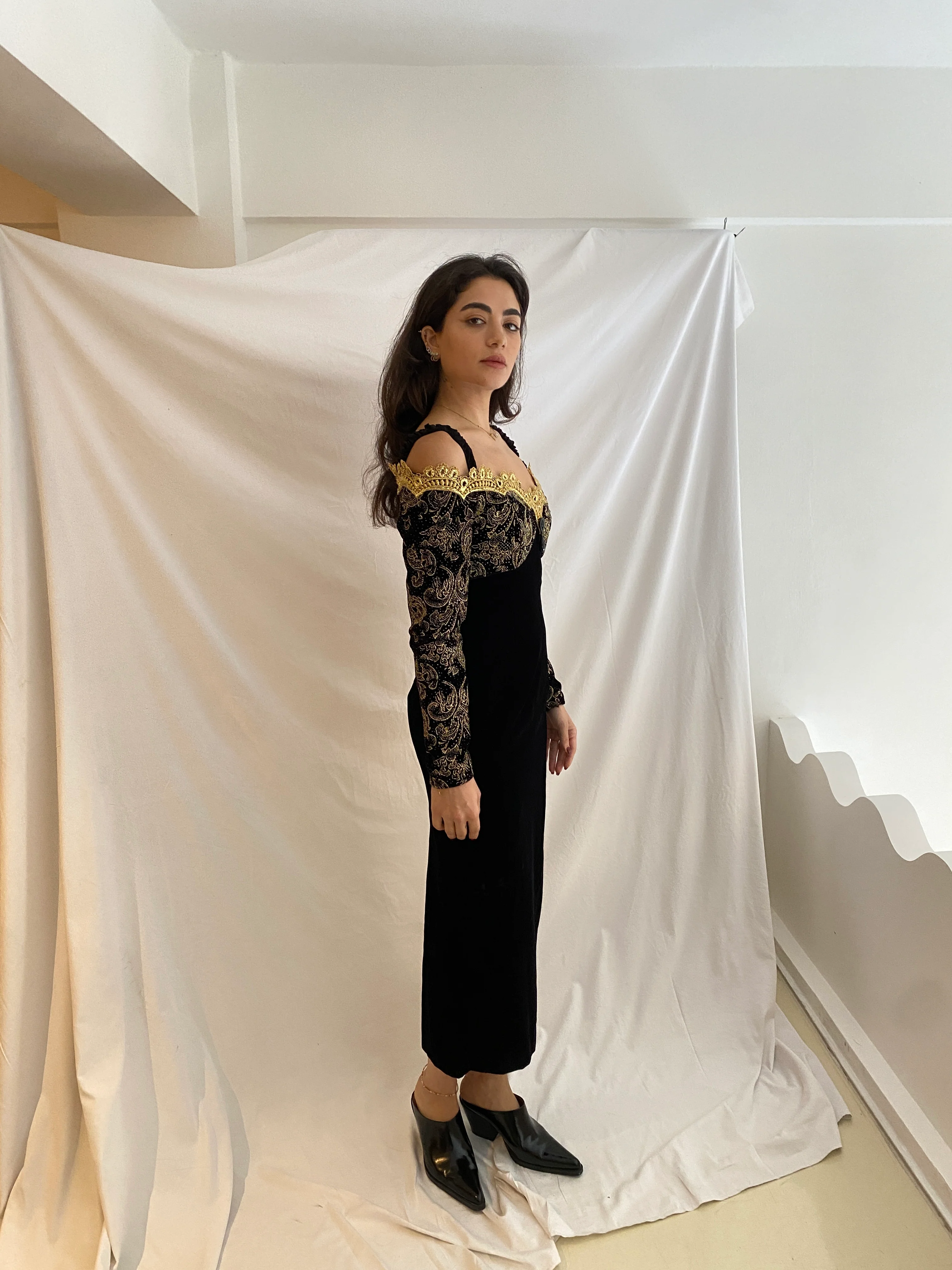 Hand-selected vintage velvet romantic dress in black and gold embroideries.