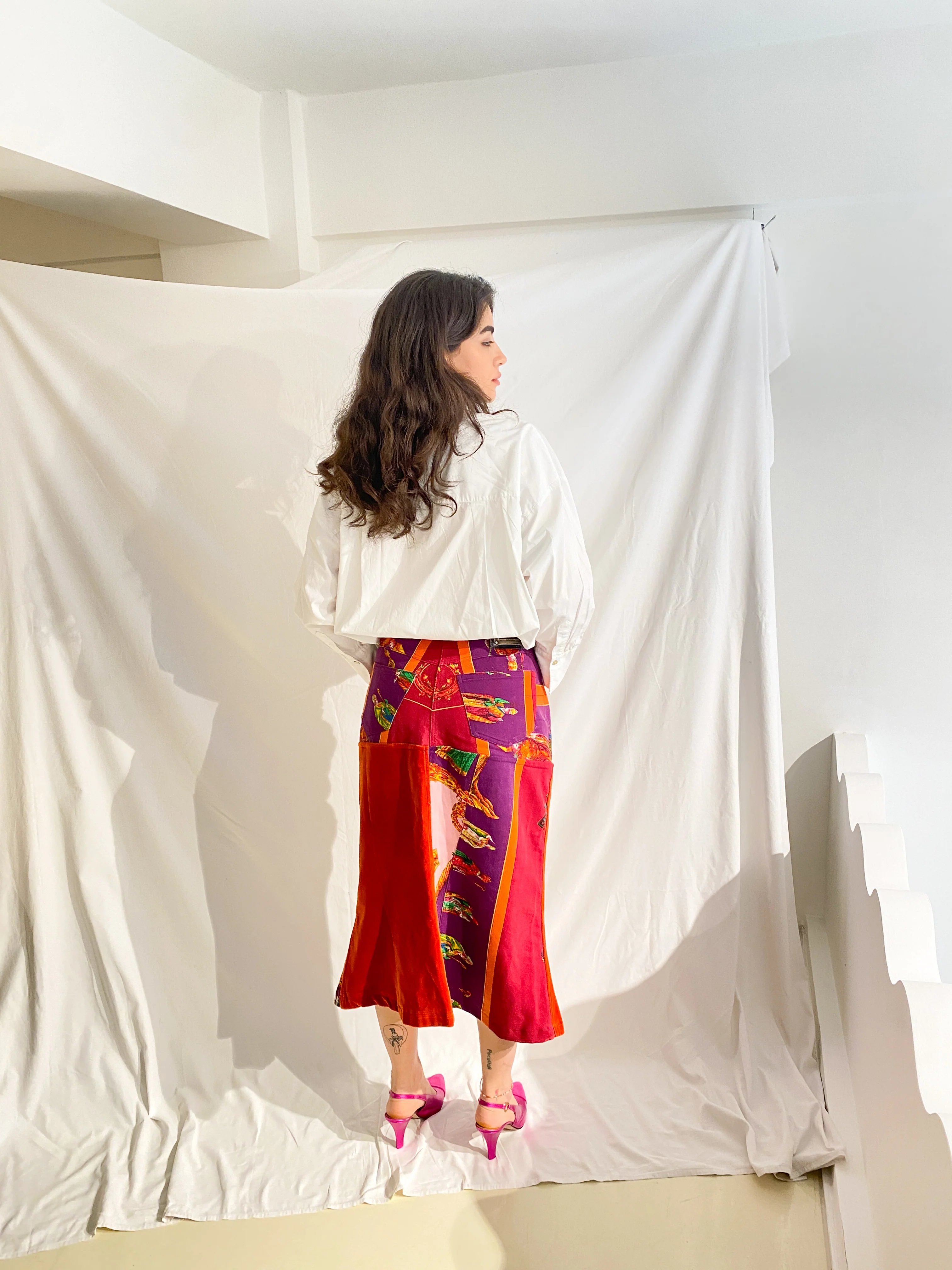 Hand-selected vintage Versace Jeans Couture skirt in a mix of denim and velvet and clergy prints.